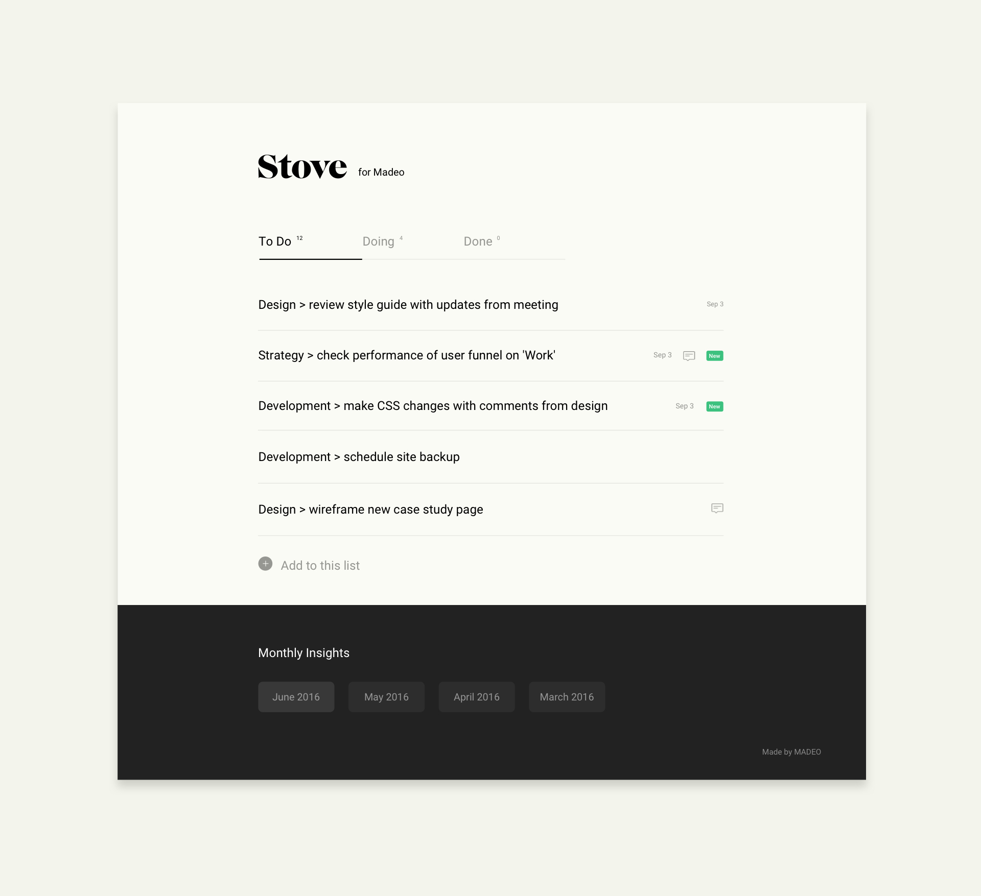 Our work in creating digital products, projects, and campaigns is incredibly collaborative. For us it is critical that we collaborate seamlessly in order to influence one another and create successful work. Stove is designed to bring client teams closer to the Madeo team by having real-time insights on progress towards our shared roadmap.