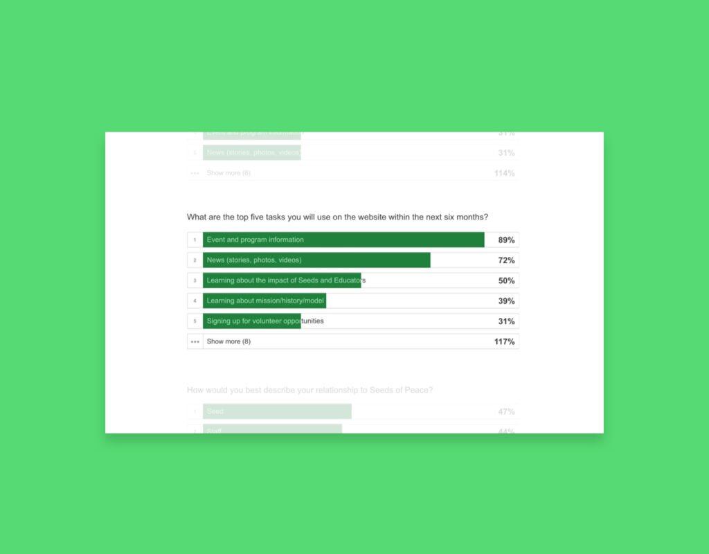 Over the course of several weeks, we combed through website user data to uncover usage patterns and challenges that visitors faced; sent a survey to staff, supporters, board members, and other important groups to learn how they used the website and what they needed; and interviewed a few key stakeholders to learn more about how we could make the website a truly useful and powerful branch of Seeds of Peace as a whole.
